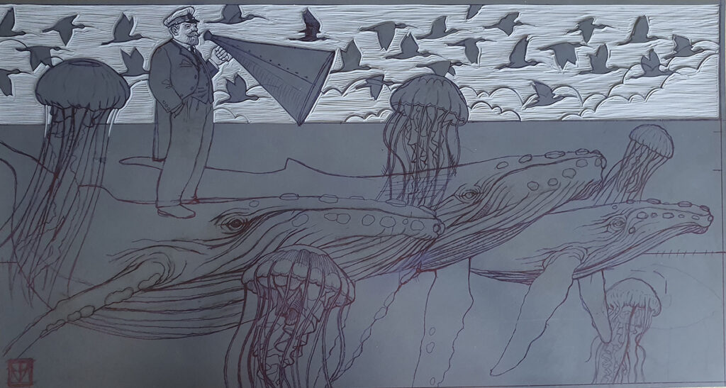 Step 1: Conceptualise artwork and draw image on the lino block with pen.