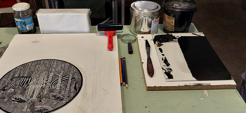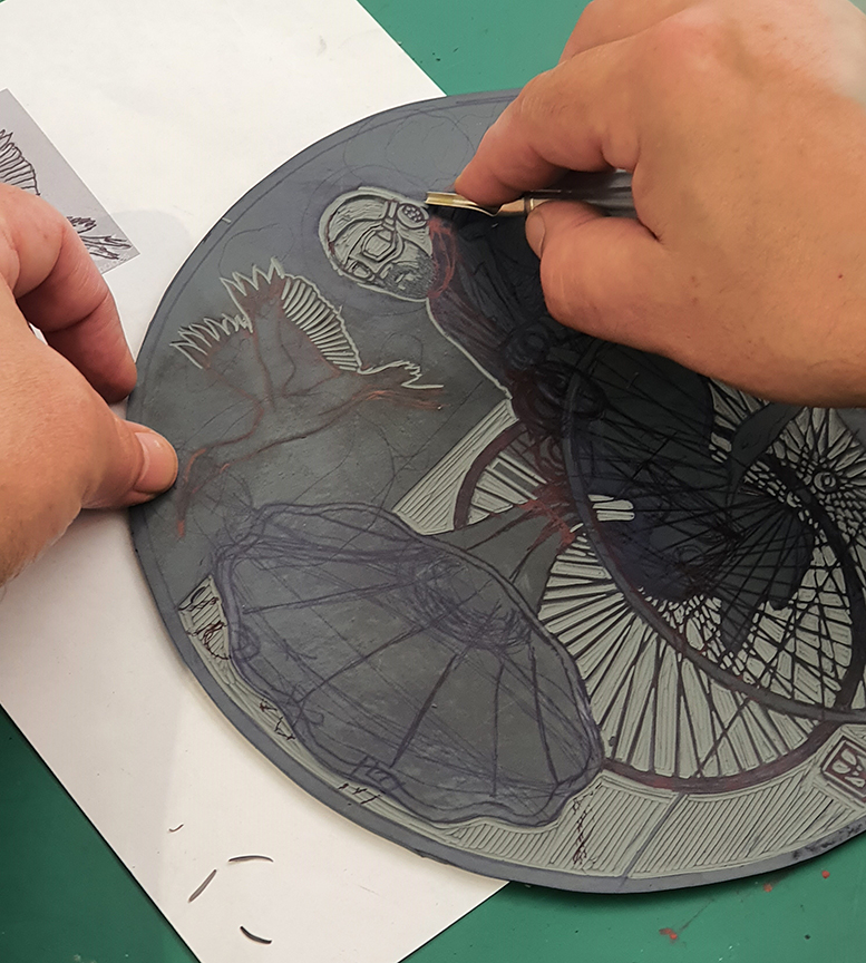 Step 2: Cutting the lino with a lino cutting tool. The finer the detail the longer it takes me to cut the work. Size also plays a role.