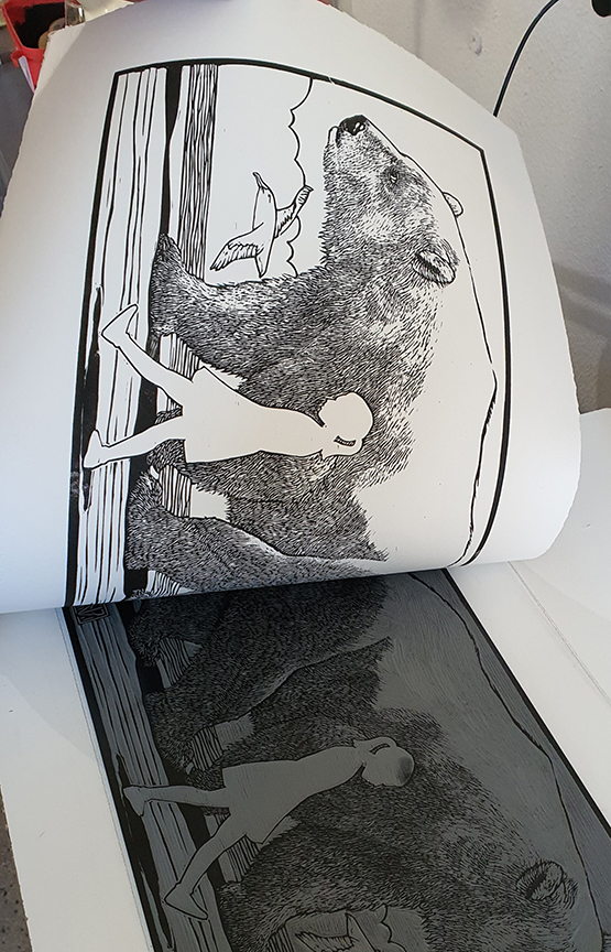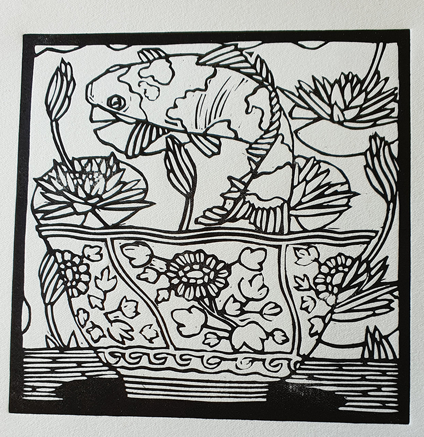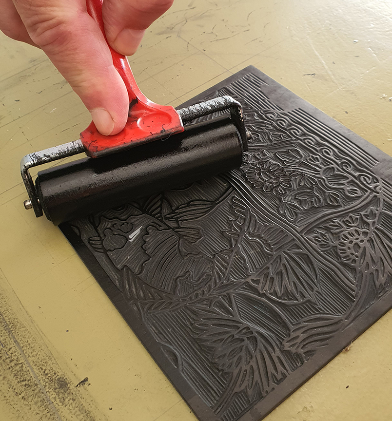 I spend a long time planning and conceptualising the artwork before transferring the image to the lino block. I transfer my image with pen onto the lino and then cut my image with a lino cutting tool. Once done I first prepare my paper by soaking it in water to make it softer to take the ink better. Just before I print I will take it out of the water and dry it with a towel. I then roll my lino block with an oil based ink using a roller.