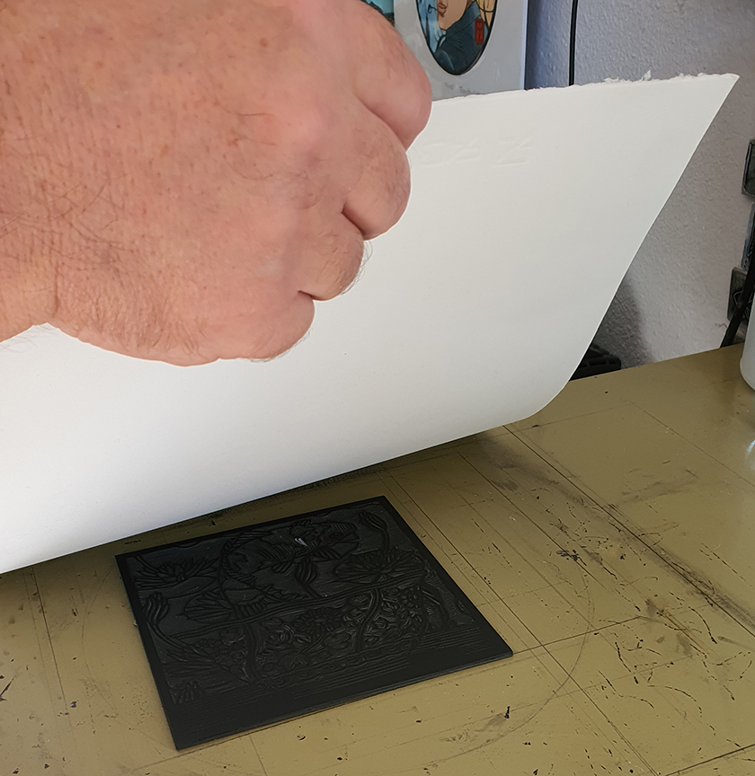 I place my paper onto the inked lino and hand print it using the spooning method.