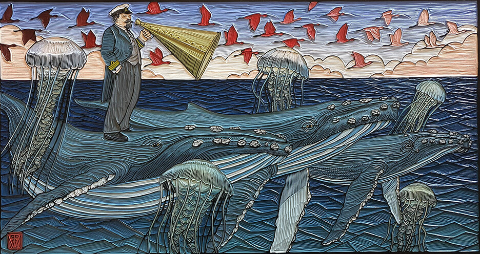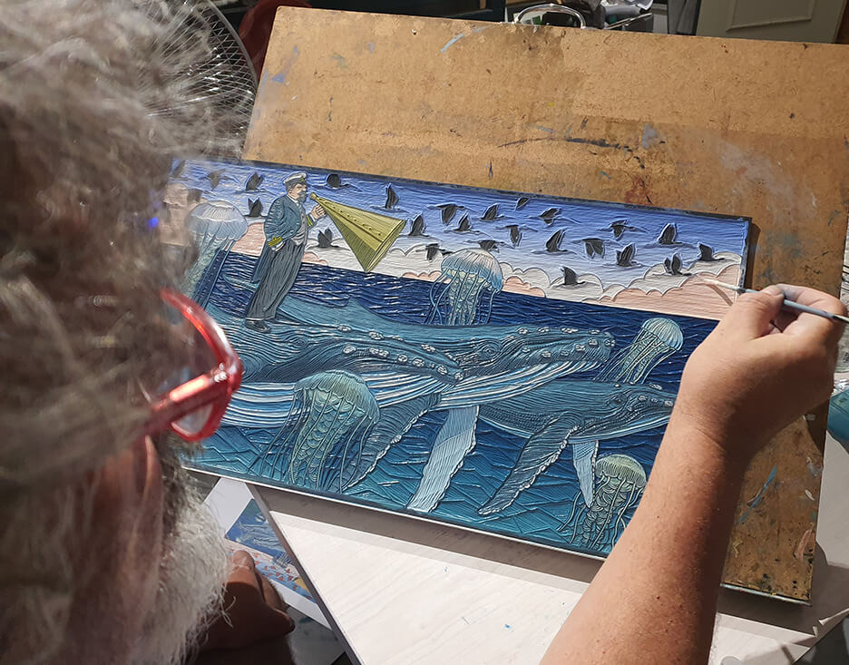 10. The final part of my process is now to paint the cut lino block with oil paint. It is then sold as an oil painting. It is highly sought after and a collector’s item.