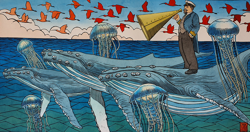 The original linocut is finished in oil paint and sold. This also makes the prints more exclusive as I cannot reprint a second edition.