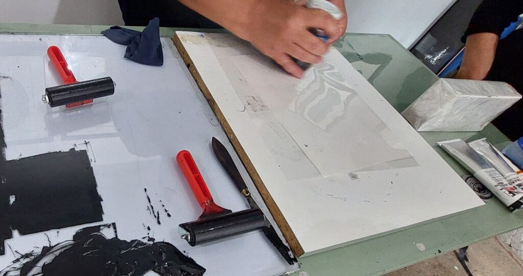 Step 3: Preparation for the printing process and registration of lino. I use an oil-based ink for my printing and print on Fabriano 50% Cotton 280 grams. Everything by hand.