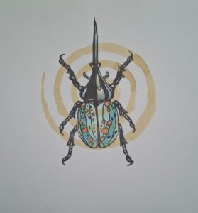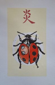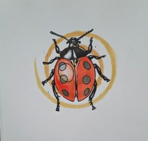 Theo Paul VorsterTitle: Ladybird-Lucky, protective, and optimisticMedium: Hand printed Lino coloured in Acrylic Ink Size: Paper Size : 21?cm ? 29.7?cm, unframed