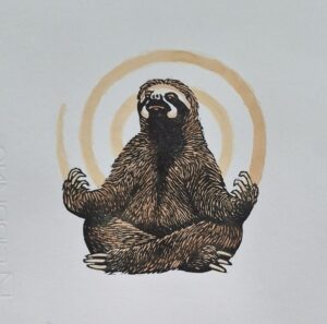 Theo Paul VorsterTitle: Sloth-Wild card (a playful, spontaneous element in my collection.)Medium: Hand printed Lino coloured in Acrylic Ink Size: Paper Size : 21cm x 29.7cm, unframed