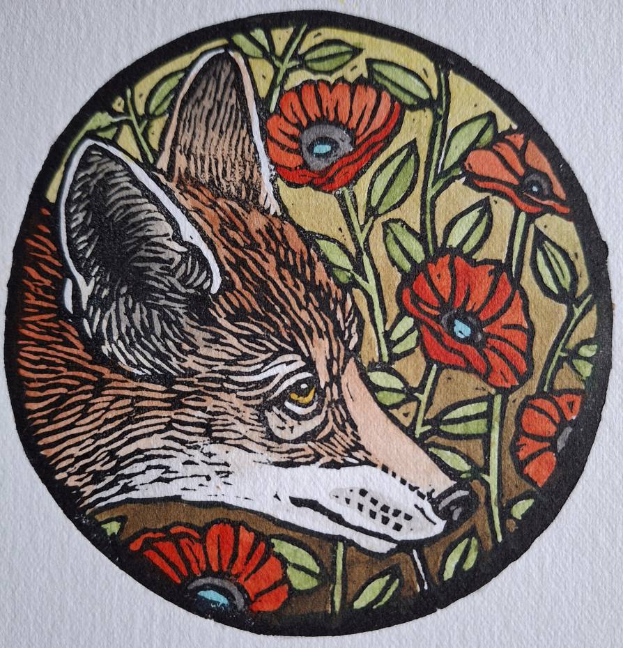 Theo Paul VorsterTitle: Foxy Lady Medium: Hand printed Lino coloured in Acrylic Ink Size: Image size 8cm in diameter, unframed