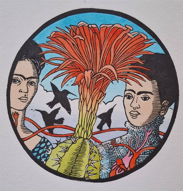 Theo Paul VorsterTitle: Frida’s FlowerMedium: Hand printed Lino coloured in Acrylic Ink Size: Image size 15 cm in diameter, unframed
