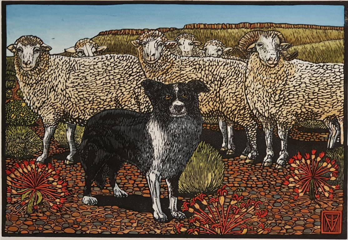 Theo Paul Vorster Title: Karoo Shepherd Medium: Hand printed Lino coloured in Acrylic Ink Size: Image size 21 x 30,5cm, unframed