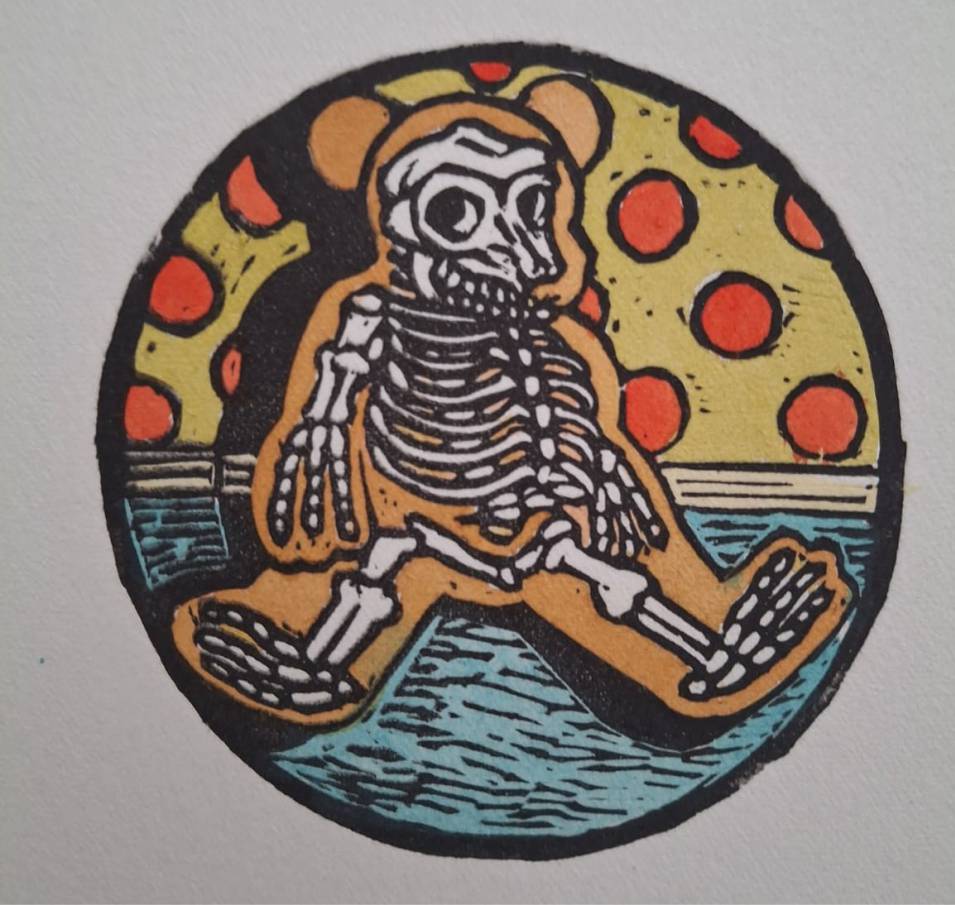 Theo Paul VorsterTitle: Teddy Bear AnatomyMedium: Hand printed Lino coloured in Acrylic Ink Size: Image size 8cm in diameter, unframed